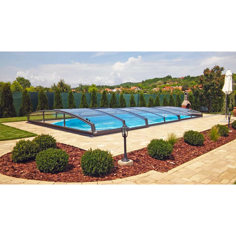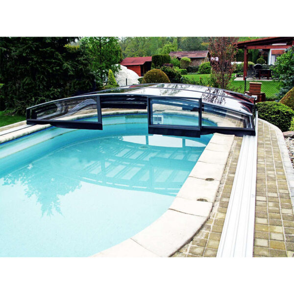 Dies ist die niedrigste Poolüberdachung der AZURE-Serie und kombiniert ein gebogenes Dach mit fast senkrechten Seitenwänden längsseitig.