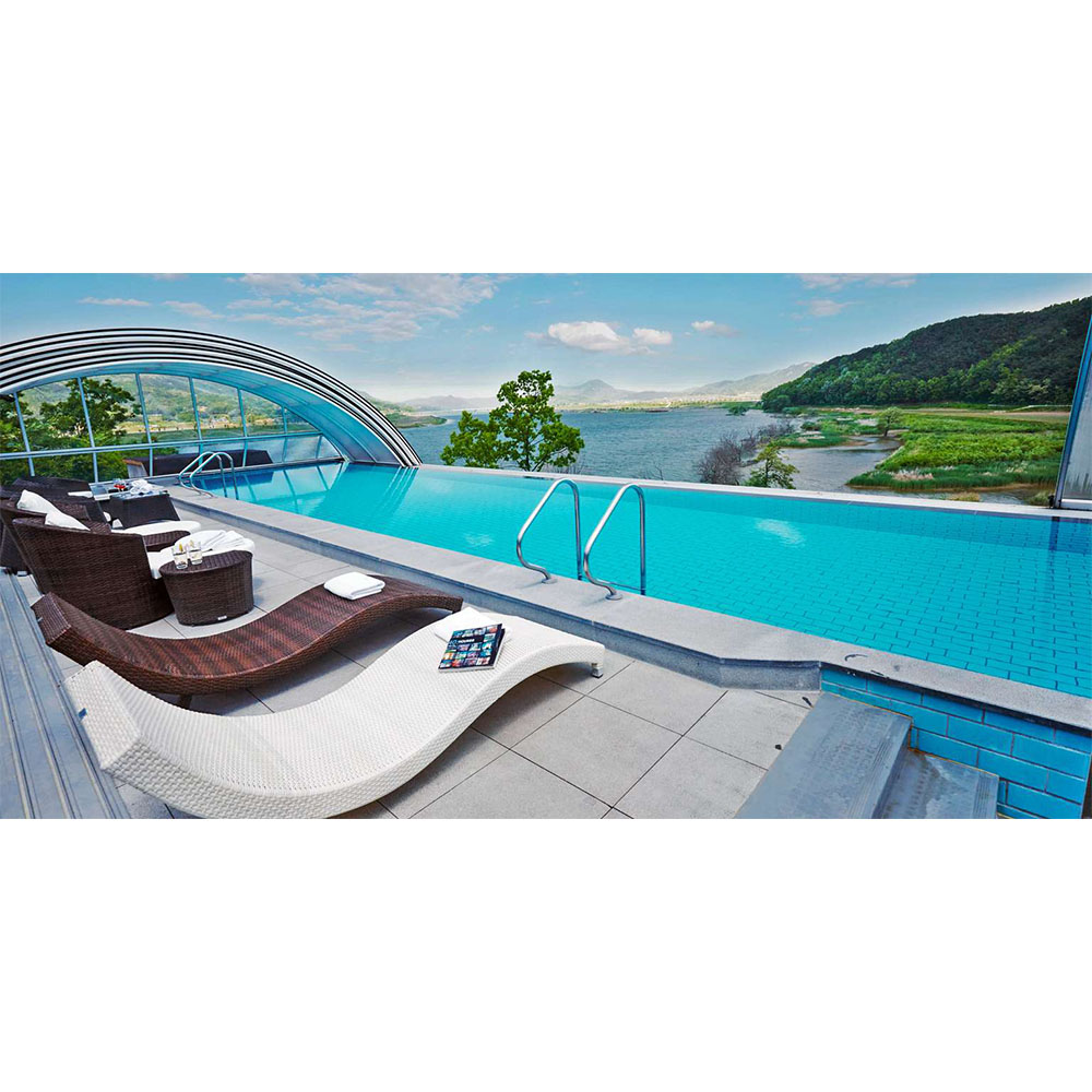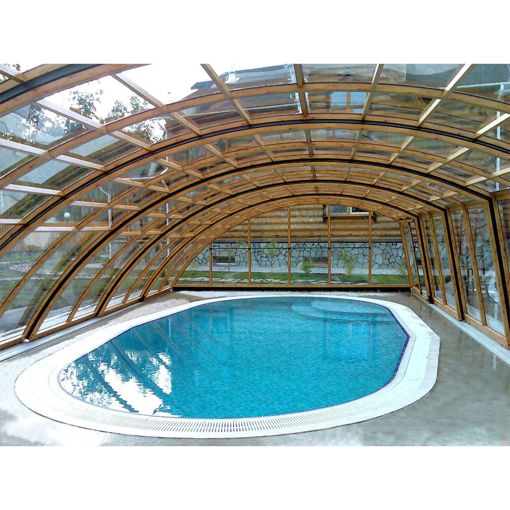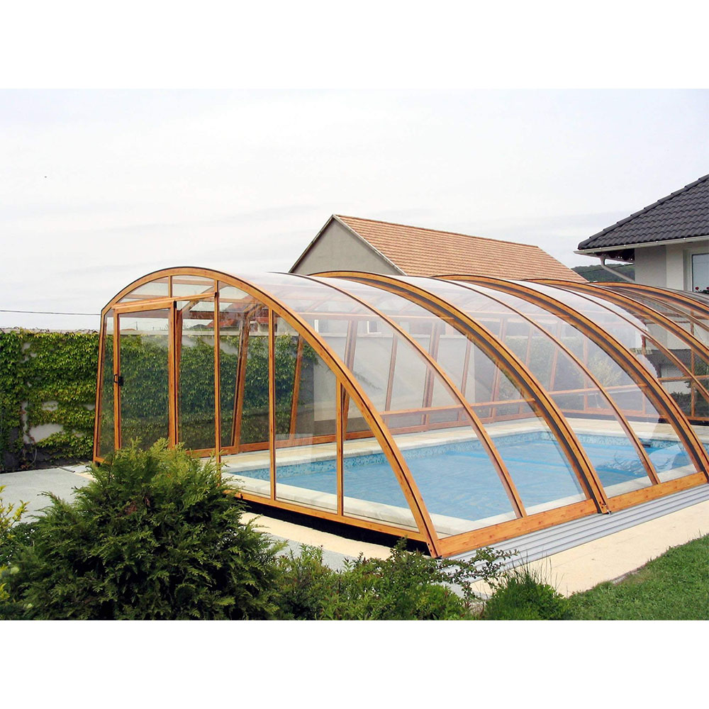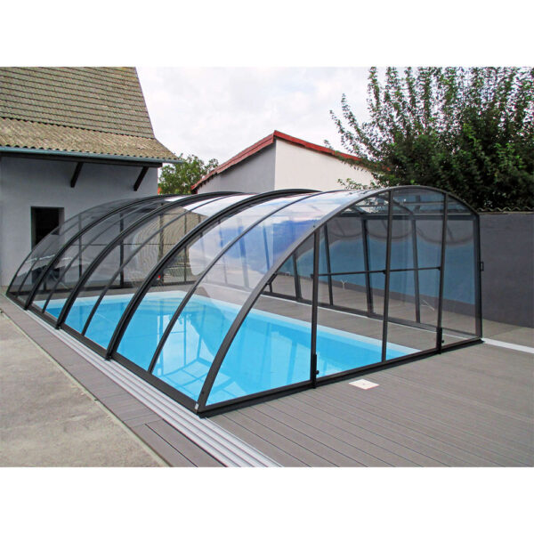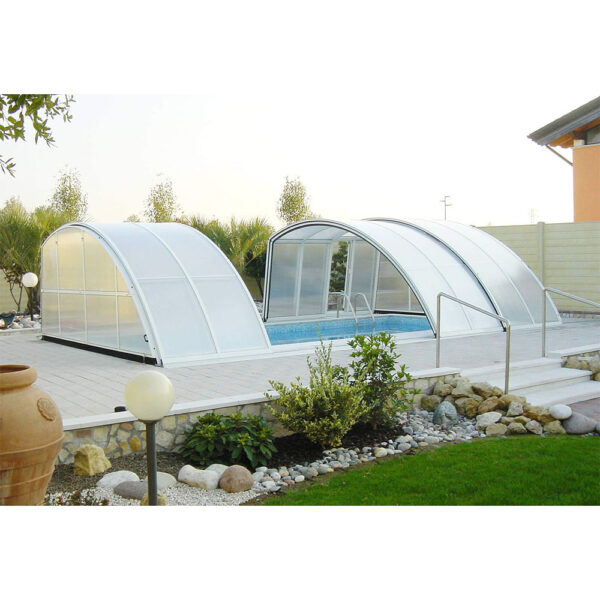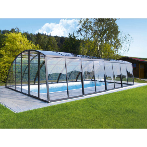 Das Modell RAVENA ist die ideale Balance von Größe und Funktionalität. Als Kombination von vertikalen Wänden (mit einem Winkel von ca. 80° zum Boden) und Bogensegmenten ermöglicht dieses Dach uneingeschränkte Bewegungsfreiheit auf drei Seiten des Pools. In der vertikalen Seitenwand ist eine Schiebetür platziert, in der Vorder- und Rückwand kann optional eine Schiebetür integriert werden. Dieses Modell eignet sich ideal für an Gebäude oder Mauern angrenzende Schwimmbäder.