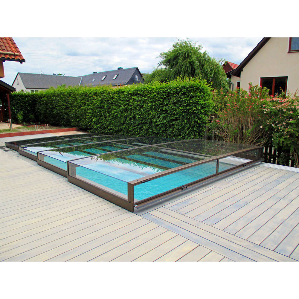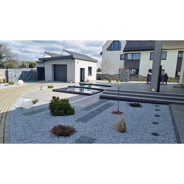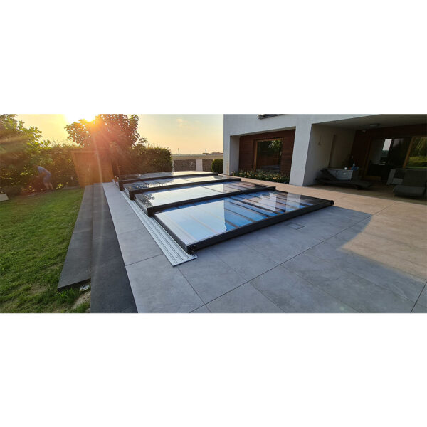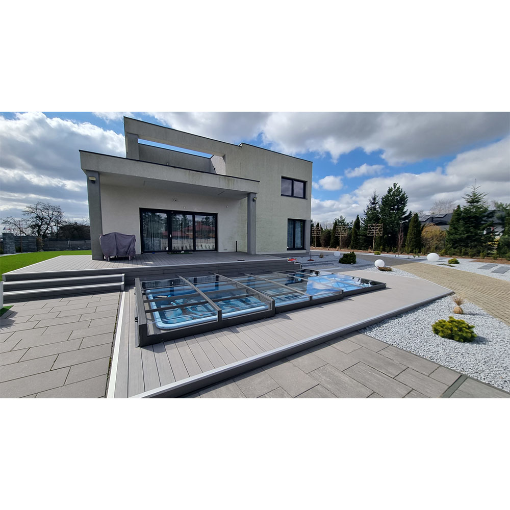 TERRA ist die niedrigste Poolüberdachung von Alukov, die die Oberfäche der Erde kopiert. In der geschlossenen Position ermöglicht absolut klare und ungestörte Aussicht in den Garten und die Umgebung des Schwimmbades. In der aufgeschobenen Position sieht sehr dezent aus, sogar fast unsichtbar.