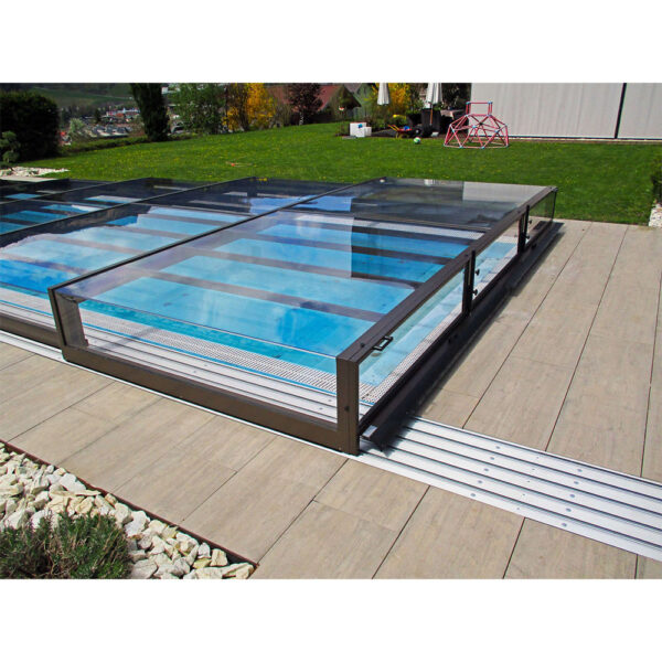Das Poolüberdachungssystem TERRA mit einer Schiene garantiert den barriererfreien Zugang aus drei Seiten und zeichnet sich durch einfache Wartung aus. Das Verschieben ist kinderleicht und sehr bequem. Die hohen Ansprüche bezüglich Sicherheitselemente, Dauerbelastung sowie führender Schienen nehmen wir bei TERRA als Standard.