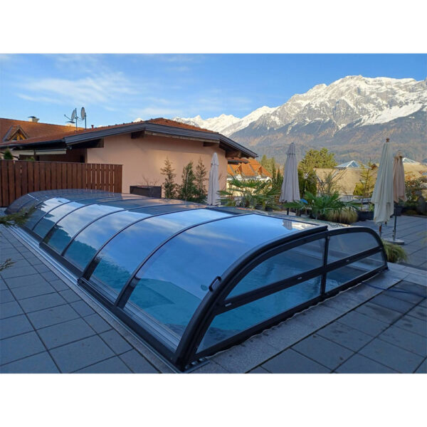 Korbbogenförmige Poolüberdachung mit massiver oder zelliger Polycarbonatverglasung. Im Interesse der Vorbeugung der Unfälle verfügen unsere patentgeschützten Profilsysteme über abgerundeten Kanten und Eckpunkten. Ihre Höhe liegt zwischen 0,65 – 1,3 m, die von der Breitengröße abhängt.