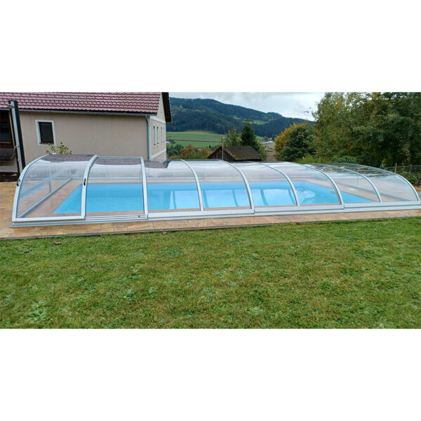 Niedrige Poolüberdachung mit Korbbogenquerschnitt und Schiebetür. Sie kann mit zelliger Polycarbonat- oder massiver, wasserklarer Polycarbonatverglasung bestellt werden.