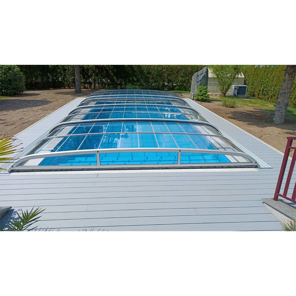 Moderne, superflache, bogenförmige Poolüberdachung ohne Tür, mit 4 mm wasserklarer, massiver Polycarbonatverglasung. Im Interesse der Vorbeugung der Unfälle verfügen unsere patentgeschützten Profilsysteme über abgerundeten Kanten und Eckpunkten. Ihre Höhe liegt zwischen 0,5 – 0,8 m, die von der Breitengröße abhängt.