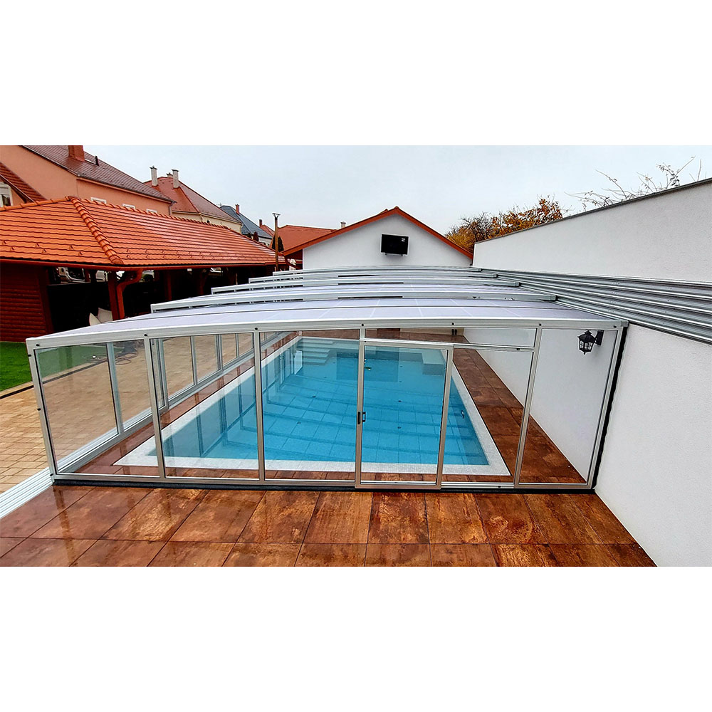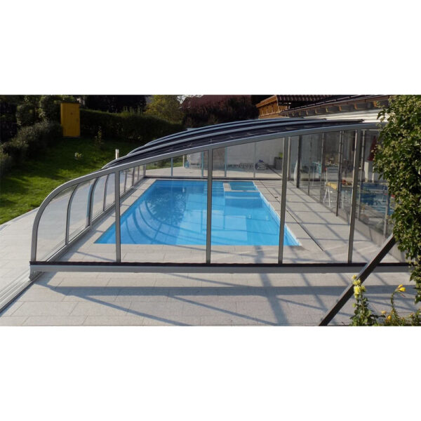 Hohe, bogenförmige, asymmetrische Poolüberdachung, mit einem mit ihrer erhöhten Seite an ein Gebäude oder anderes Tragwerk befestigtem Bahnsystem. Sie kann mit Schiebe- oder Drehtür auf der Seiten- oder Vorderwand bestellt werden. Sie kann je auf Wunsch mit zelliger Polycarbonat- oder massiver, wasserklarer Polycarbonatverglasung bestellt werden.